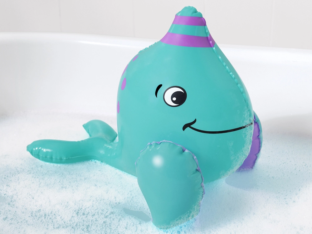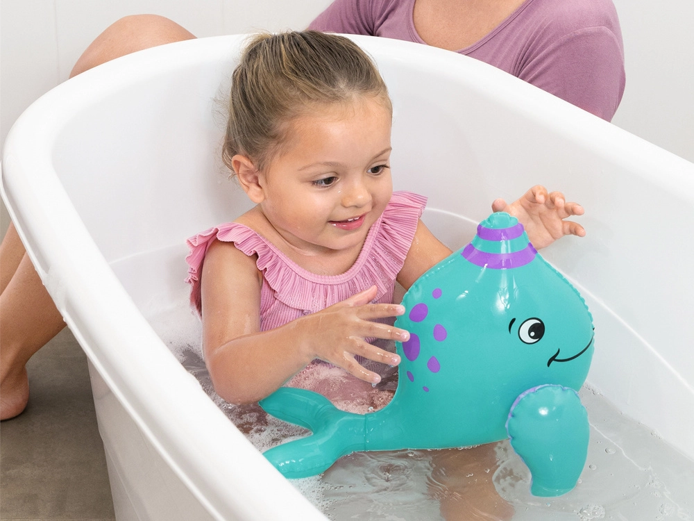 Dzieci zanurzą się w świecie fantazji bawiąc się z tym dmuchanym stworem podczas kąpieli.