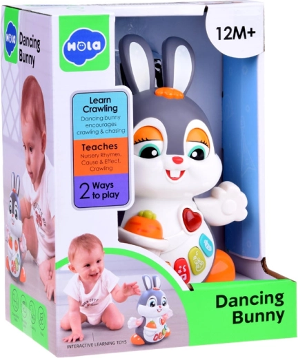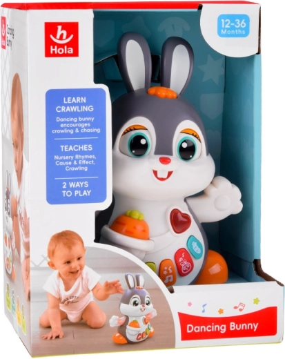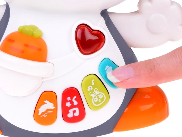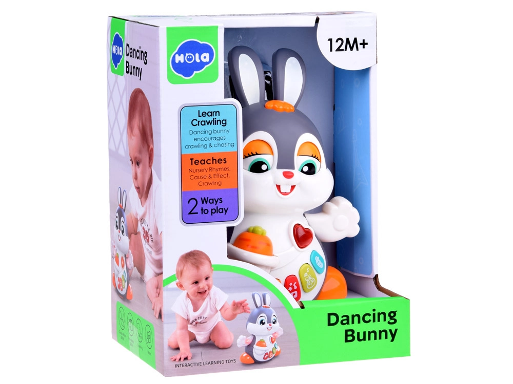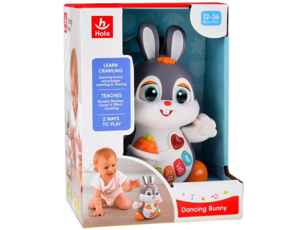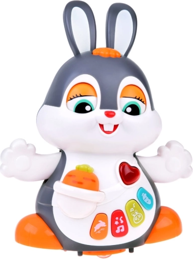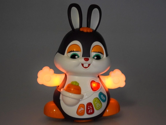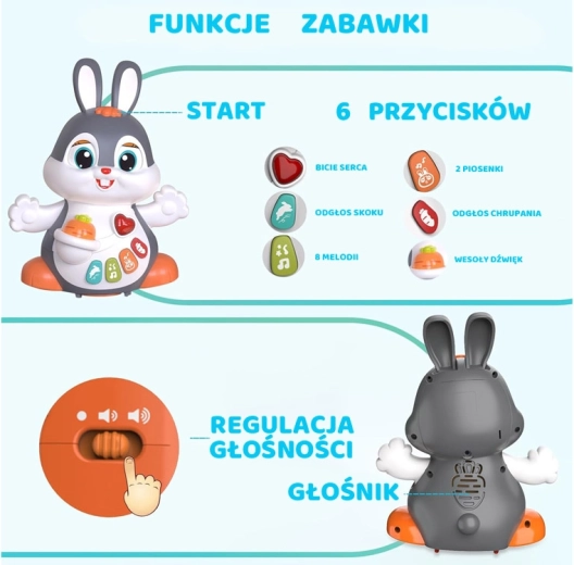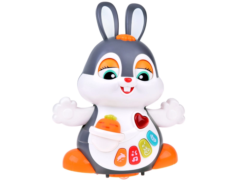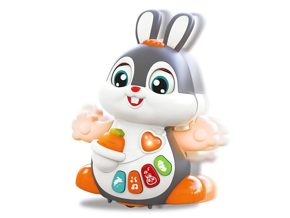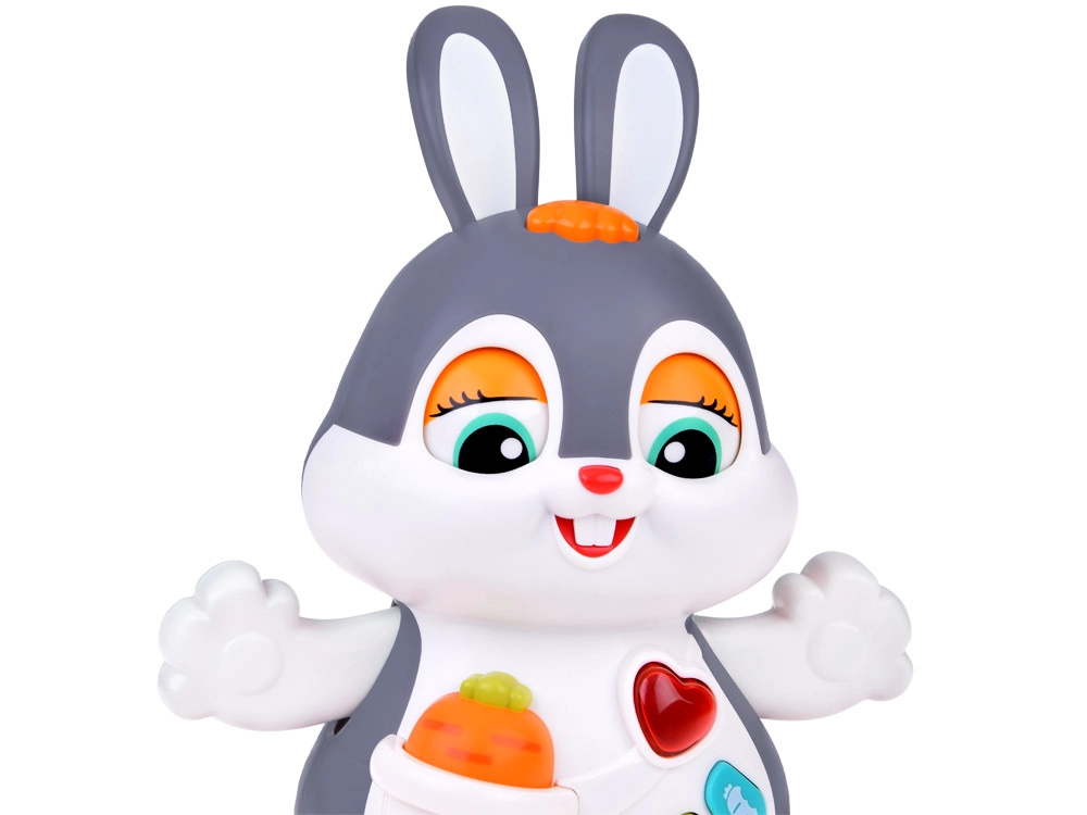 Interaktywny tańczący króliczek to świetny towarzysz pierwszych kroków i raczkowania. Zabawka potrafi się poruszać, mruga oczami i świeci w rytm muzyki. Dzieci zainteresują kolorowe przyciski z różnymi funkcjami: melodie, bicie serca, dźwięki skakania czy chrupania marchewki – wszystko w towarzystwie efektów świetlnych.