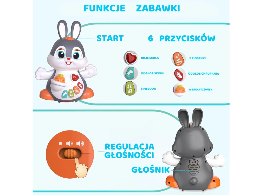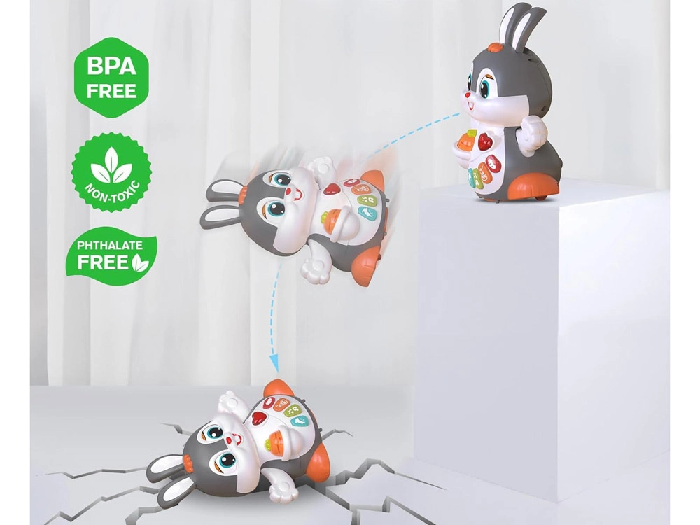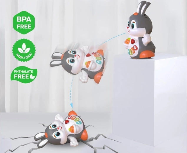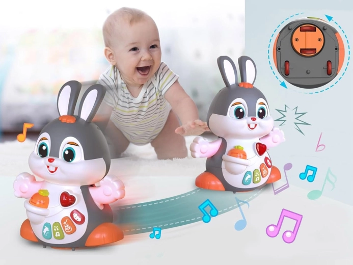 Po uruchomieniu króliczek tańczy/jeździ, mruga oczami i porusza łapkami. Naturalnie zachęca dzieci do podążania za nim i aktywnego ruchu.