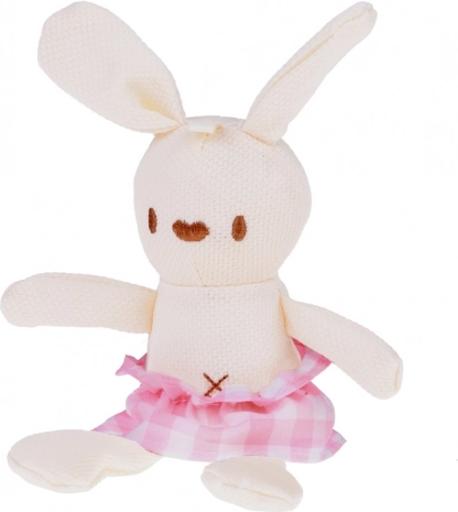 W zestawie znajduje się miękki króliczek w kraciastej spódniczce – idealny towarzysz do przytulania i zabaw w udawanie.