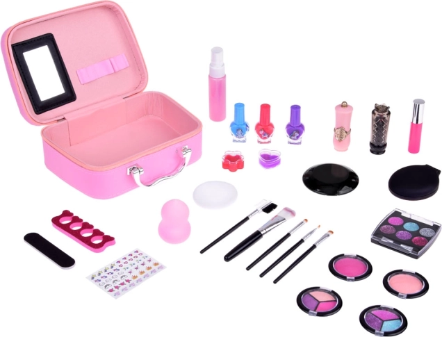 Bogate wyposażenie: Etui pomieści różne produkty kosmetyczne, takie jak cienie do powiek, błyszczyki do ust, lakiery do paznokci, pędzelki i aplikatory. Wszystkie produkty są bezpieczne dla dzieci i łatwo zmywalne.