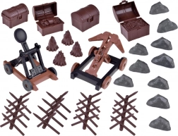 W opakowaniu znajdziesz bogate akcesoria: skrzynie ze skarbami, beczki, drabinę, flagi, ogniska, skały i inne elementy otoczenia, dzięki którym stworzysz sugestywne sceny. Mniejsze i większe figurki (ok. 3 i 6 cm) są idealne do dziecięcych rąk i łatwo je łączyć.