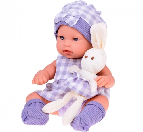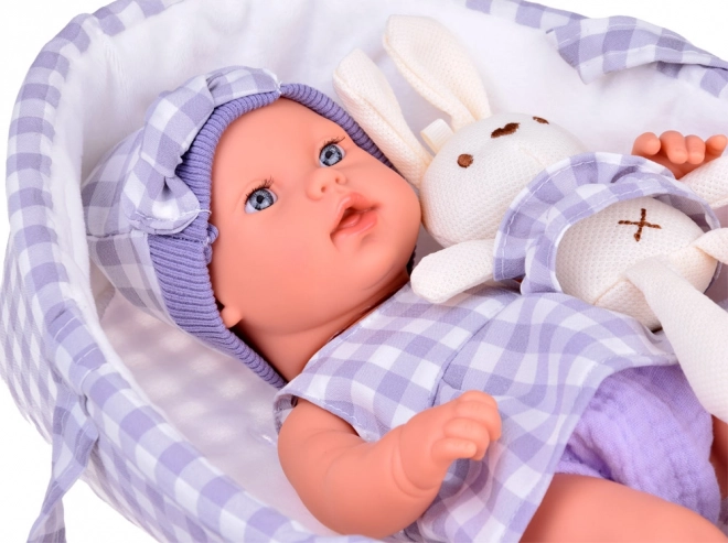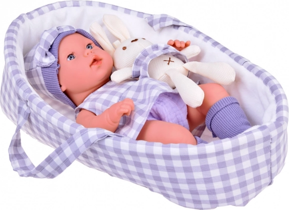 Urocza realistyczna lalka niemowlę w dopasowanym tekstylnym koszyku ucieszy każdą małą opiekunkę. W zestawie znajduje się także miękki pluszowy króliczek w tej samej kraciastej spódniczce, przenośne nosidełko z uchwytami oraz stylowy szary strój z czapeczką i sukienką. Lalka ma ruchome kończyny i jest wykonana z trwałego, łatwego do czyszczenia plastiku, co zapewnia bezpieczną i długotrwałą zabawę.