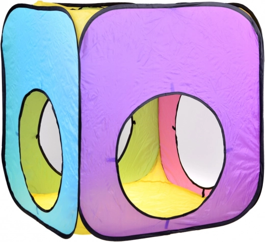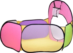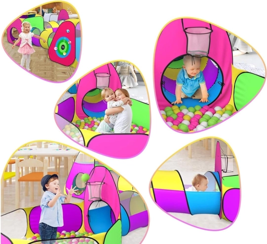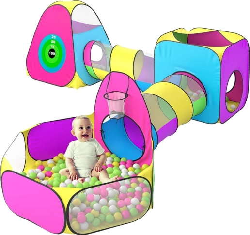 Każdy namiot oferuje inne aktywności: trójkątny namiot z tarczą i otworami do celowania piłeczkami na rzep, kwadratowy namiot z dwoma wejściami i możliwością podłączenia tuneli oraz namiot – basenik/kojec idealny na suchy basen z piłeczkami (piłeczki nie są częścią zestawu). Kolorowe panele i siateczkowe elementy wspierają stymulację wzrokową oraz nadzór dorosłych.