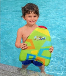 Deska o wymiarach 42x32x3,5 cm ma ergonomiczny kształt. Została wykonana z trwałej pianki o doskonałej wyporności. Dodatkowo została pokryta tkaniną z kolorową grafiką, co zapewnia wygodny chwyt i zapobiega wyślizgiwaniu się z rąk. Odpowiednia dla dzieci w wieku 3 do 6 lat.