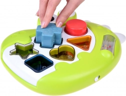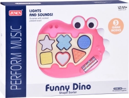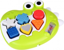Ten uśmiechnięty Dinozaur ma różne kształty otworów: trójkąt, kwadrat, koło, serce, gwiazdę i krzyżyk, które dziecko musi poprawnie umieścić. Każdy element ma inną barwę i fakturę, co czyni zabawę sensorycznie interesującą. Niektóre elementy zawierają koraliki, które wydają dźwięk podczas potrząsania.