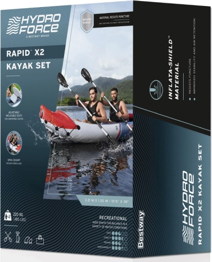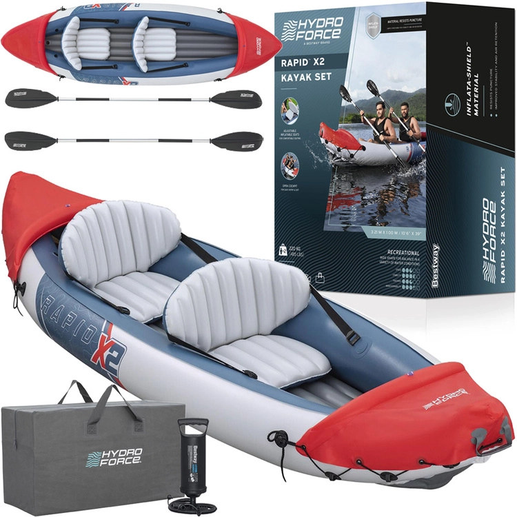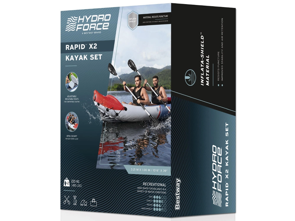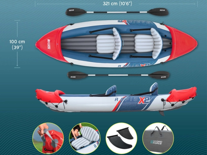 - Udźwig do 160 kg oraz wymiary po napompowaniu 321 × 88 cm dla wygodnego wiosłowania we dwoje