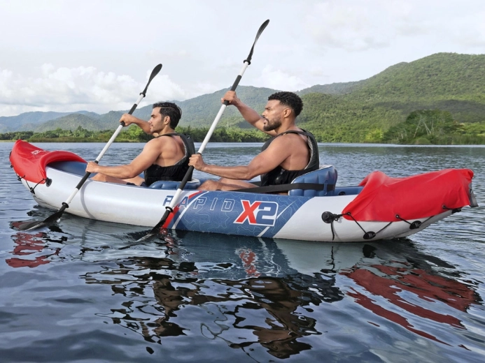 Ciesz się spokojnymi jeziorami, zatokami i wolniejszymi rzekami w kajaku tandemowym, który łączy mocną i odporną konstrukcję z PVC (0,57 mm) z wyjątkową praktycznością. Dzięki szybkim zaworom śrubowym/Boston łatwo się pompuje i spuszcza powietrze, a miękka podłoga I‑beam zapewnia sztywność i komfort podczas wiosłowania.