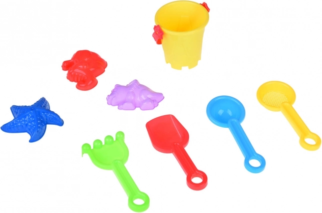 1× wiaderko, 3× foremki (rozgwiazda, konik morski, dinozaur), 2× łopatka, 1× grabki, 1× sito