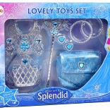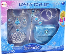 Ten zestaw został zaprojektowany specjalnie dla dziewczynek, utrzymany w pastelowym, niebieskim kolorze, ozdobiony błyszczącymi elementami i lśniącymi kamieniami. Świetny wybór na bale karnawałowe, urodziny, imprezy tematyczne lub do codziennych domowych stylizacji.