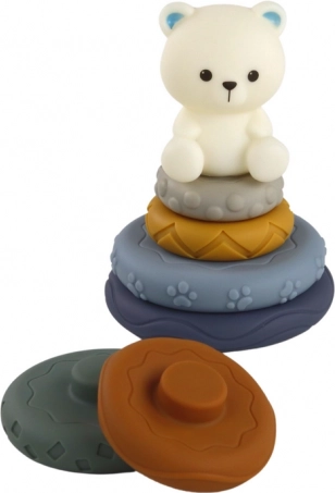 Kolorowa piramida z białym misiem na szczycie pomaga dzieciom w koordynacji oko-ręka i logicznym myśleniu.