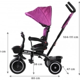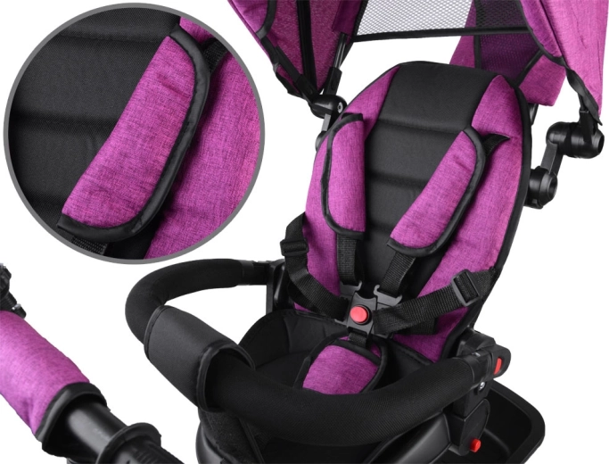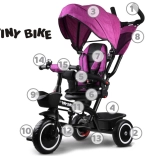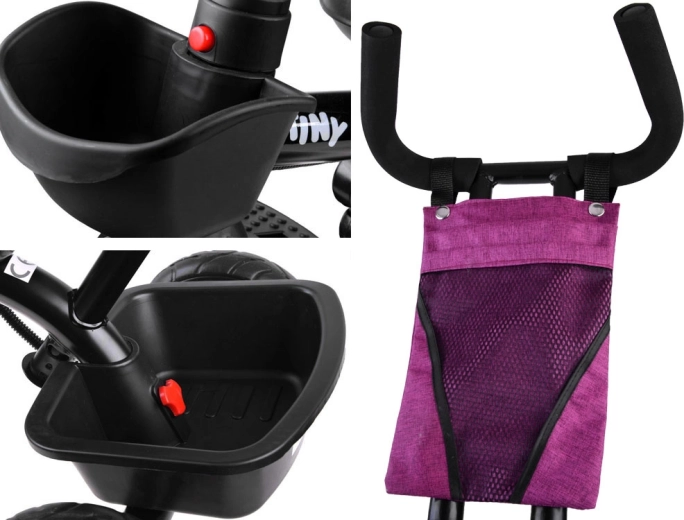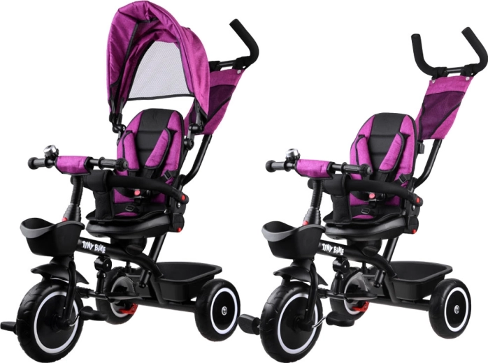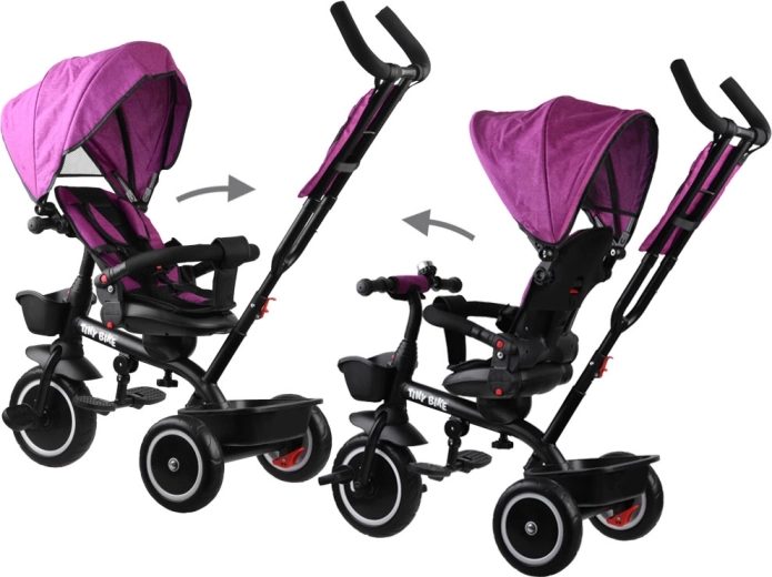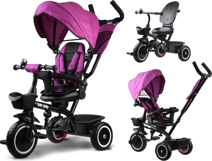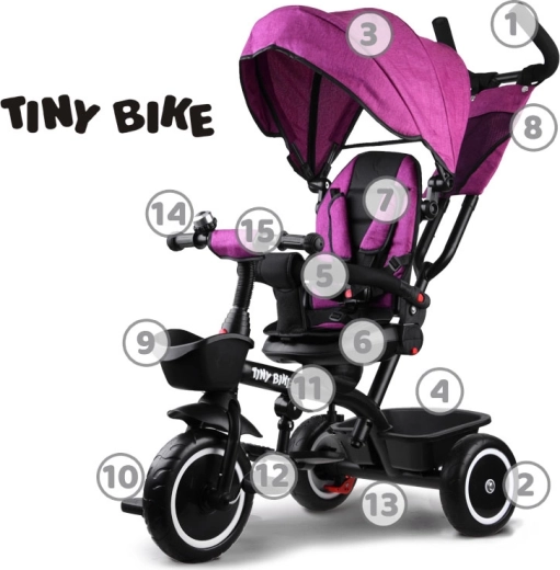 Praktyczny dziecięcy trójkołowiec 3w1 TINY BIKE z obrotowym siedziskiem i daszkiem przeciwsłonecznym rośnie wraz z Twoim dzieckiem od 6 miesięcy do 5 lat. Oferuje wygodę, 5‑punktowe pasy, składaną budkę z siatką, prowadzenie przez rodzica oraz bezobsługowe koła EVA dla bezpiecznych i płynnych przejażdżek.