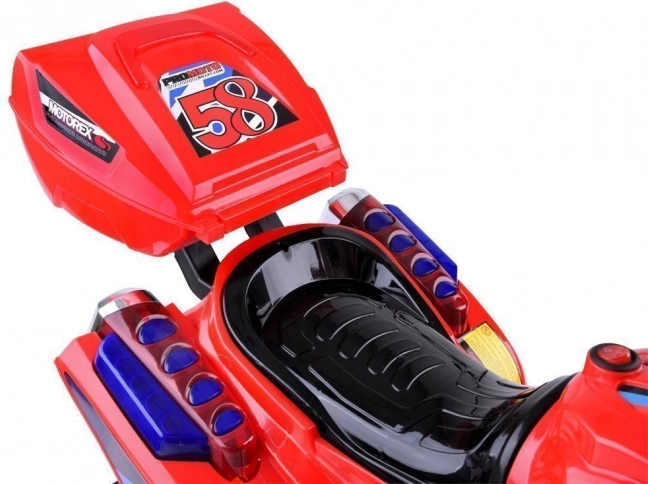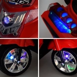 Stylowy dziecięcy motocykl na akumulator z kolorowym oświetleniem LED z przodu, po bokach oraz w kołach zapewnia bezpieczną i pełną frajdy jazdę w domu i na zewnątrz. Dzięki elektrycznemu hamowaniu po zwolnieniu gazu, wygodnemu wsiadaniu oraz praktycznemu tylnemu kuferkowi to idealny wybór dla małych kierowców, którzy kochają prędkość i efekty świetlne.