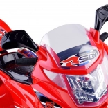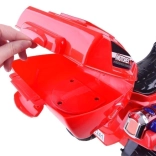 Obsługa jest prosta: start przyciskiem ON/OFF z realistycznym dźwiękiem silnika, gaz w pedale oraz automatyczny elektryczny hamulec po zwolnieniu pedału. Dzieci ucieszą wesołe melodie, lusterka boczne, przeźroczysta owiewka i praktyczny kuferek na drobiazgi.