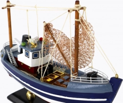 Model wyróżnia się wysokimi masztami, rozpiętą siecią rybacką na pokładzie, kabiną uzupełnioną o klaksony i światła ostrzegawcze. Na dziobie znajduje się dekoracyjne koło sterowe, które przywołuje bogatą tradycję żeglugi. Doskonały wybór jako stylowa dekoracja wnętrz do salonu, biura lub na półkę kolekcjonerską.