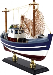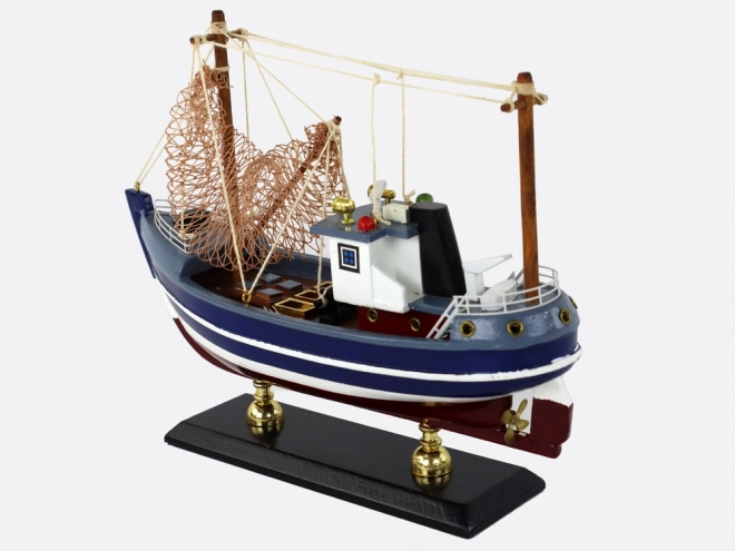 Ten starannie wykonany drewniany model przedstawia klasyczny kuter rybacki na stabilnych drewnianych nóżkach. Połączenie ciemnego granatu i białych pasów podkreśla tradycyjny marynistyczny styl, a precyzyjnie oddane detale zapewniają realistyczny wygląd.