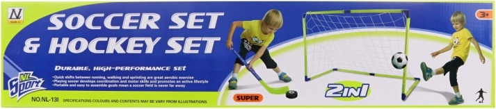 Uniwersalna bramka do piłki nożnej i hokeja 2w1 dla dzieci, kompletny zestaw z piłką i wyposażeniem hokejowym.