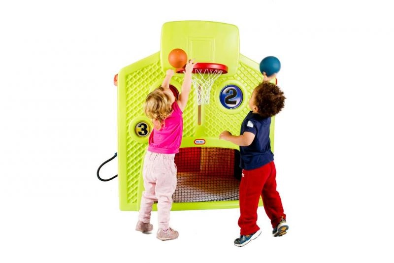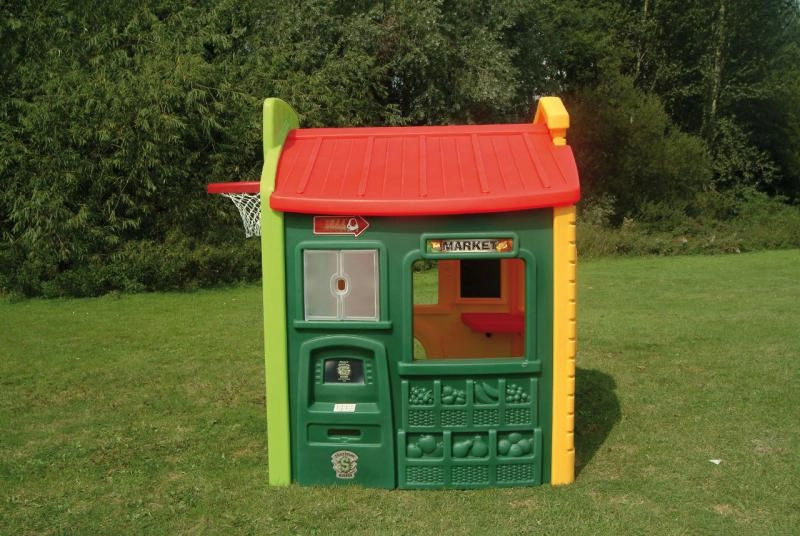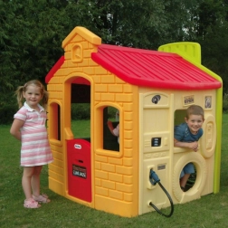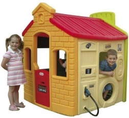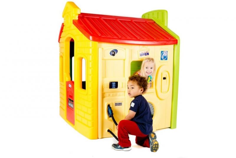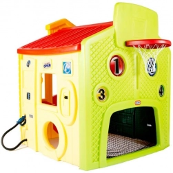 Domek Little Tikes zachęca do różnorodnych zabaw dzięki czterem ścianom, z których każda ma swój unikalny motyw. Ściana sportowa zawiera kosz, piłeczkę i tarczę do rzucania. Ściana ze stacją benzynową jest wyposażona w dystrybutor, telefon i specjalnie profilowane detale. Sklep/restauracja ma okienko z okiennicami, kasę, półkę wewnątrz domku oraz profilowane akcesoria. Część szkolna obejmuje stolik, tablicę, alfabet i cyfry. Domek ma podwójne ściany, które chronią przed słońcem i pogodą, jest odporny na uderzenia.