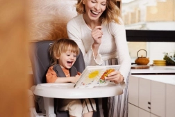 Krzesełko ma dwustopniową regulację tacki, a co ważne, zewnętrzną tackę można myć w zmywarce.