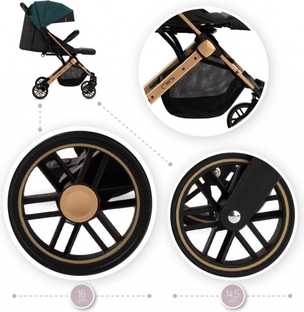 MoMi Estelle to idealny miejski wózek dla rodziców, którzy cenią lekką konstrukcję, bezproblemową jazdę i maksymalne bezpieczeństwo. Dzięki wysokiej jakości kołom PU odpornym na przebicie i pełnej amortyzacji wszystkich czterech kół gładko pokonuje nierówności. Powiększana budka z podwójną warstwą i ochroną UV zapewnia przyjemny cień i lepszy komfort termiczny.