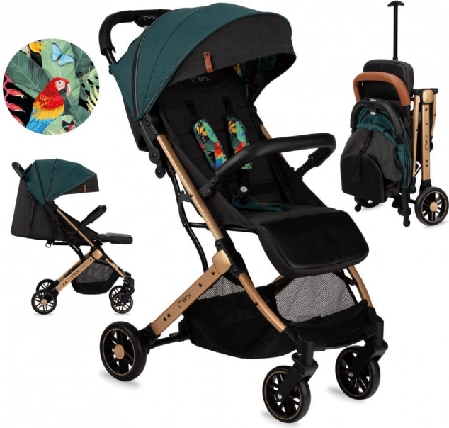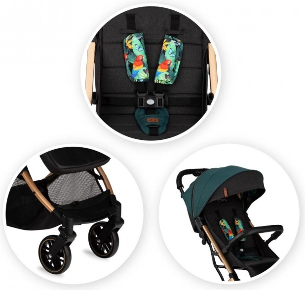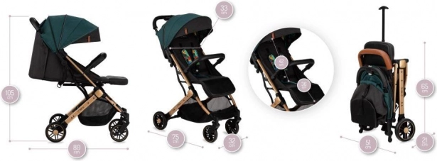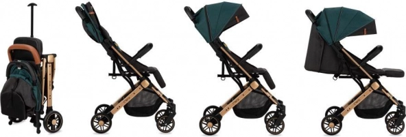Dla dziecka wózek oferuje maksymalną wygodę: regulowane oparcie, regulowany podnóżek z łatwą w czyszczeniu ekoskórą oraz pięciopunktowe pasy bezpiecznie utrzymują małego pasażera na miejscu. Dla rodziców są szybkie składanie, funkcja samodzielnego stania po złożeniu, teleskopowa rączka do ciągnięcia/pchania jak walizki i pojemny kosz na zakupy.