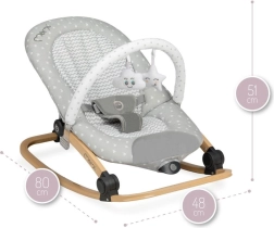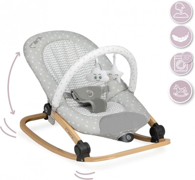 Leżaczko MoMi Lumiwood zapewnia idealne warunki do odpoczynku twojego dziecka. Dzięki trzypunktowemu pasowi bezpieczeństwa i specjalnemu pasowi kroczkowemu twoje dziecko jest zawsze bezpieczne. Leżaczko jest wyposażone w jednostkę sensoryczną, która generuje melodie i wibracje.