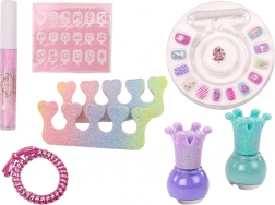 Paletka tipów, 2 separatory, gumka do włosów, naklejki, 2 lakiery, pilniczek i błyszczyk do ust – kompletny mini salon w jednym opakowaniu.