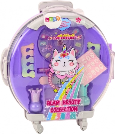 Uroczy dziecięcy kosmetyczny kuferek na kółkach z 9 elementami do kreatywnego zdobienia paznokci i zabawnego makijażu. Kompaktowy fioletowy „salon to go” zawiera wszystko do kreatywnej zabawy, błyszczących lakierów, naklejek na paznokcie oraz praktycznych akcesoriów. Idealny w podróży i w domu, z naciskiem na bezpieczną zabawę i rozwój wyobraźni.