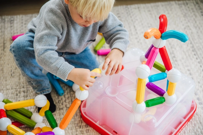 Odkryj duży zestaw SMARTMAX dla małych budowniczych: pojemnik z 100 magnetycznymi elementami do tworzenia dużych budowli, mostów i konstrukcji. Odpowiedni już od 1 roku, świetny do zabawy w domu, w przedszkolach i kącikach dziecięcych. Praktyczny pojemnik z czerwoną pokrywką i dnem służącymi jako płyty bazowe ułatwia przechowywanie i budowanie. Bezpieczna magnetyczna układanka konstrukcyjna spełniająca normy ASTM F963 i EN71.