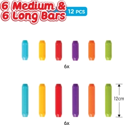 Zestaw zawiera pręty w różnych kolorach, które wspierają kreatywność i pozwalają tworzyć atrakcyjne, barwne konstrukcje.