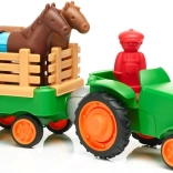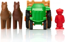 Zestaw zawiera traktor i dwa koniki, które dzieci mogą składać według własnych pomysłów. Figurka rolnika dodaje zabawności, stymulując kreatywną zabawę i rozwój umiejętności społecznych u dzieci. Z jasnymi kolorami i prostym designem jest to zestaw odpowiedni dla małych rączek.