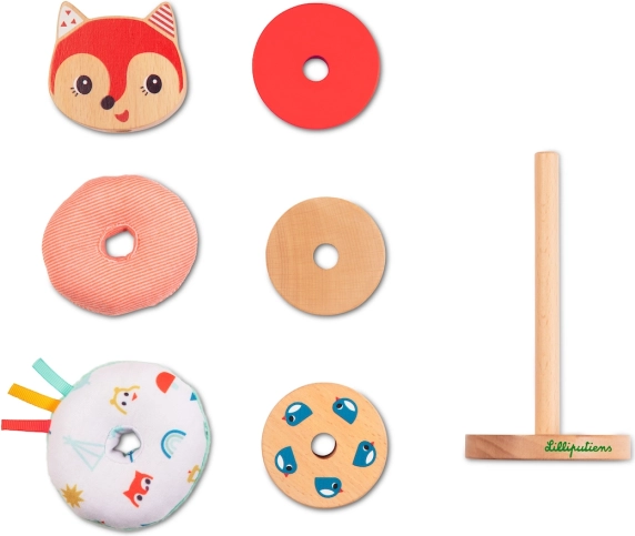 Z piramidą do układania Lisiczka Alice dzieci doświadczą kreatywnej zabawy, która wspiera ich umiejętności motoryczne. Składa się z różnych elementów, w tym 4 drewnianych i 2 tekstylnych części oraz drewnianej podstawy. Każda zabawa tą piramidą jest inna dzięki możliwości różnorodnego zestawiania elementów.