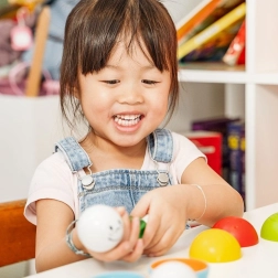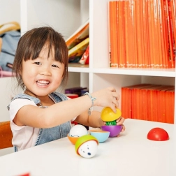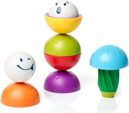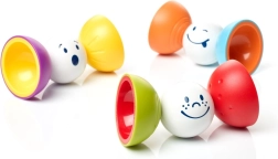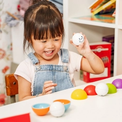 Wesołe twarzyczki i żywe kolory motywują dzieci do układania, sortowania i zabawy w chowanego z kuleczkami.