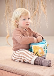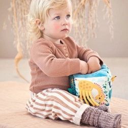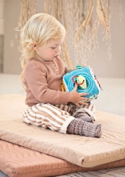 Kostka oferuje różne faktury, które pomagają rozwijać małą motorykę oraz koordynację ręka–oko.