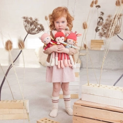 Haftowane oczy, usta i piegi, miękkie tkaniny oraz wysoka jakość wykonania zapewniają spokojną zabawę i zasypianie.