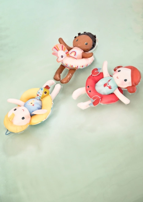 Lalka unosi się na wodzie dzięki kolorowemu kołu w kształcie jednorożca i zaprasza dzieci do radosnych wodnych przygód w wannie i basenie.