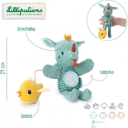 Urocza pacynka z kolekcji smok Joe marki Lilliputiens pobudza wyobraźnię i zmysły maluchów od 6 miesięcy. Ma otwory na palce dla łatwego ożywiania, w głowie ukryte grzechotki, na brzuszku miękkie lusterko oraz na sznureczku szeleszczące kurczątko. Doskonałe wykonanie, bezpieczne materiały i delikatne faktury wspierają małą motorykę, koordynację ręka–oko oraz percepcję dźwięku, wzroku i dotyku.