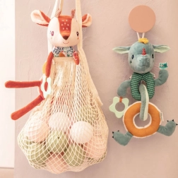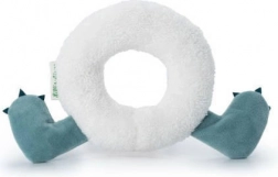 Różnorodne materiały (sztruks, miękkie futerko itp.) rozwijają zmysł dotyku, a sznureczki przy główce zapewniają łatwe i stabilne przymocowanie do wózka lub fotelika.