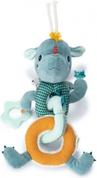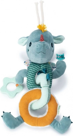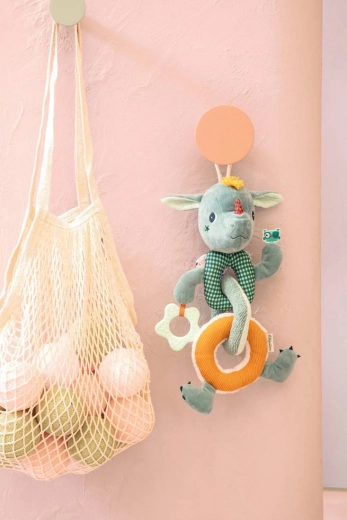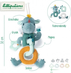 Sensoryjny łańcuszek Lilliputiens z motywem smoczka Joe składa się z trzech miękkich ogniw, które można rozłączać i ponownie łączyć dzięki środkowemu kółku z magnetycznym zapięciem. W główce ukryta jest grzechotka, jedna łapka ma teksturowany gryzak w kształcie gwiazdki, a druga sensoryczną naszywkę. Grzywa, róg na pyszczku, skrzydełka, uszka, wstążeczki i drobne pazurki zachęcają do odkrywania i stymulują dotyk.