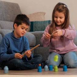 Łap drewniane butelki za pomocą haczyka, kółka i rybki – czysto mechanicznie, bezpiecznie i zabawnie. Dzieci ćwiczą małą motorykę i wyczucie ruchu.