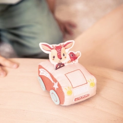 Miękki samochodzik zdobi jelonek Stella i ptaszek Robin, którzy dodają zabawce uroku i atrakcyjności.