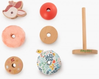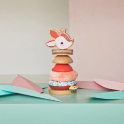 Jelonek Stella zaprasza małych konstruktorów do świata odkrywania. Ta piramida do układania z wysokiej jakości drewna i miękkich elementów tekstylnych wspiera koordynację ręka–oko, cierpliwość i zręczność. Elementy można układać w dowolnej kolejności – nie ma dobrego ani złego sposobu, dlatego każde ułożenie wygląda nieco inaczej i pobudza kreatywność.