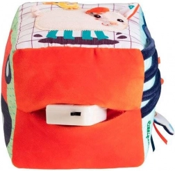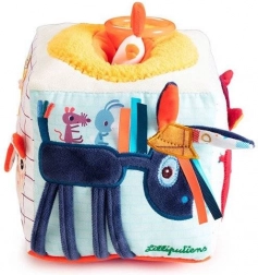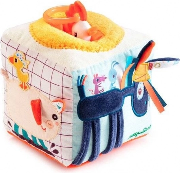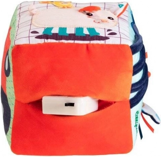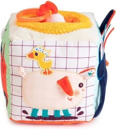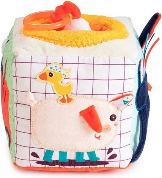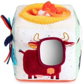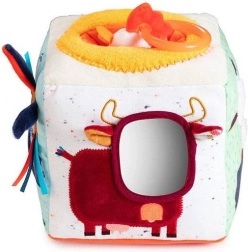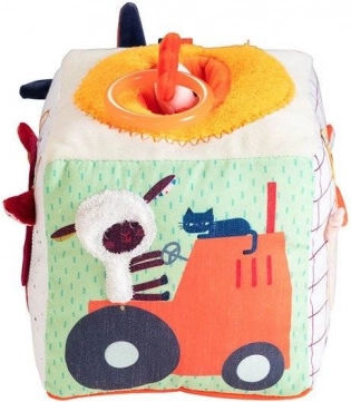 Ta mięciutka kostka jest pełna niespodzianek: krówka Rosalie z lusterkiem, owieczka Yvon na traktorze, kaczor Gaston na śwince Simonie, osiołek Ignace z bujną grzywą z paseczków oraz kurka Paulette w swoim miękkim gniazdku. Po potrząśnięciu kostka wydaje odgłosy zwierząt gospodarskich – zadaniem dziecka jest znaleźć bohatera, do którego pasują.