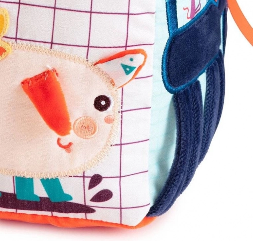 Dzięki różnym fakturom, kieszonkom i detalom (ciągnięcie, wkładanie, wyjmowanie) zabawka wspiera motorykę małą i koordynację ręka–oko, a jednocześnie stymuluje wzrok, słuch i dotyk. Pierścień–gryzak na elastycznym sznureczku przynosi ulgę przy ząbkowaniu i łatwo go chwycić nawet małymi rączkami.
