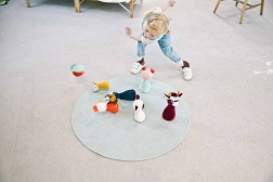 Rzucanie, turlanie i celowanie miękką piłeczką z dzwoneczkiem wspiera koordynację oko–ręka, równowagę oraz pierwsze umiejętności sportowe.