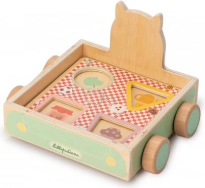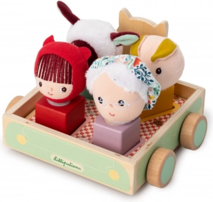 Odkryj zabawny wózek do ciągnięcia z postaciami od Lilliputiens, w którym wilk Ludwik wiezie babcię, Czerwonego Kapturka, prosiaczka i owieczkę. Ta sprytna zabawka łączy w sobie wózek do ciągnięcia, sorter i rozpoznawanie kształtów. Dzięki rzepom główki postaci łatwo mocuje się do drewnianych kształtów, co świetnie rozwija motorykę małą, koordynację oko–ręka oraz wyobraźnię dzieci.