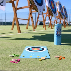 Skok! Łucznictwo to wciągająca gra rodzinna, w której gracze „wystrzeliwują” drewniane żetony w kierunku tarczy i rywalizują o najwyższy wynik. Wybierz kolor żetonów, ustal linię startu – bliżej dla większej precyzji lub dalej dla większego wyzwania – i pokaż swoje umiejętności.