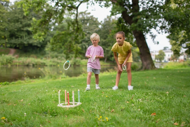 Ta tradycyjna gra z drewnianą podstawą i kolorowymi kółkami jest idealna do zabawy na zewnątrz i w pomieszczeniach. Sprawdź swoje umiejętności w rzucaniu kółek na kolorowe kołki i zdobywaj jak najwyższe wyniki. Gra jest wciągająca i wymagająca, ponieważ możesz regulować odległość rzutu.