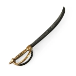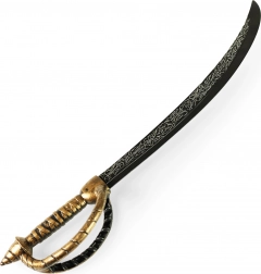 - Zakrzywiona klinga ze srebrnymi ornamentami, złoto-czarna rękojeść z osłoną dłoni