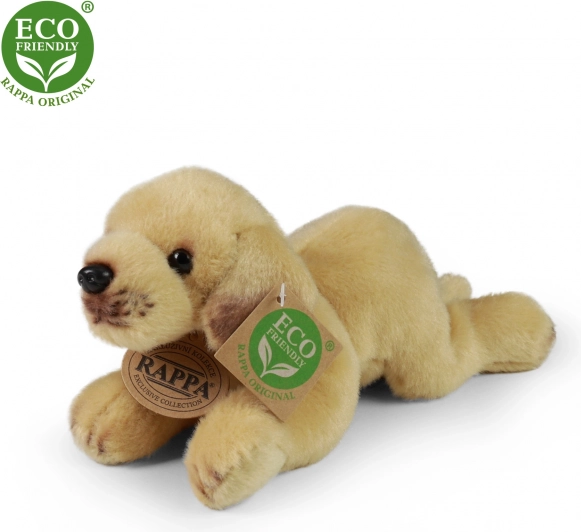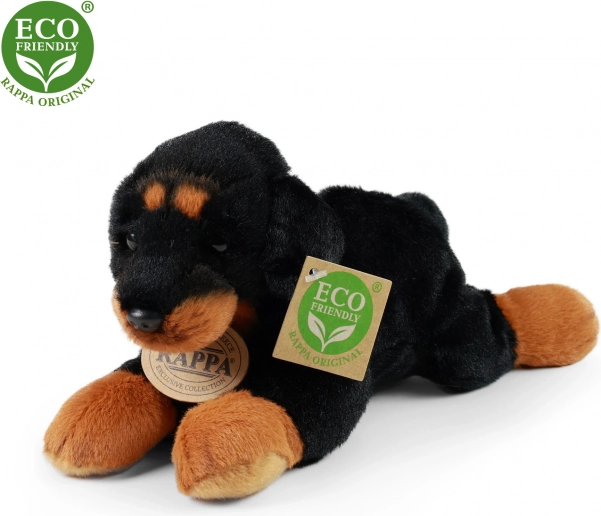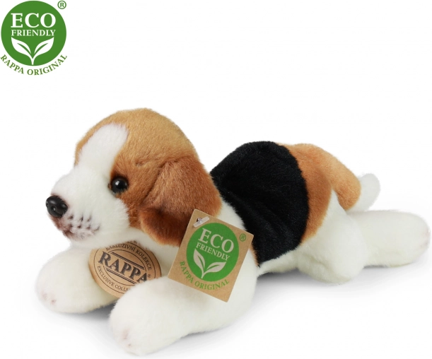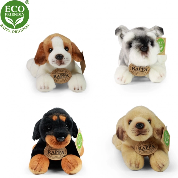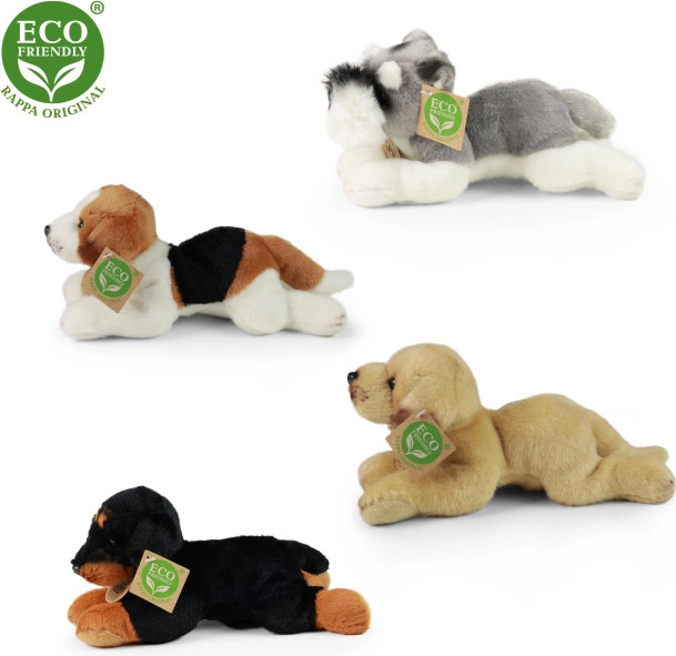 Pluszowy pies leżący o wielkości 16 cm, dostępny w różnych rasach, takich jak beagle, bracco, labrador czy rottweiler. Wykonany z ekologicznych materiałów, które spełniają wszystkie standardy bezpieczeństwa.